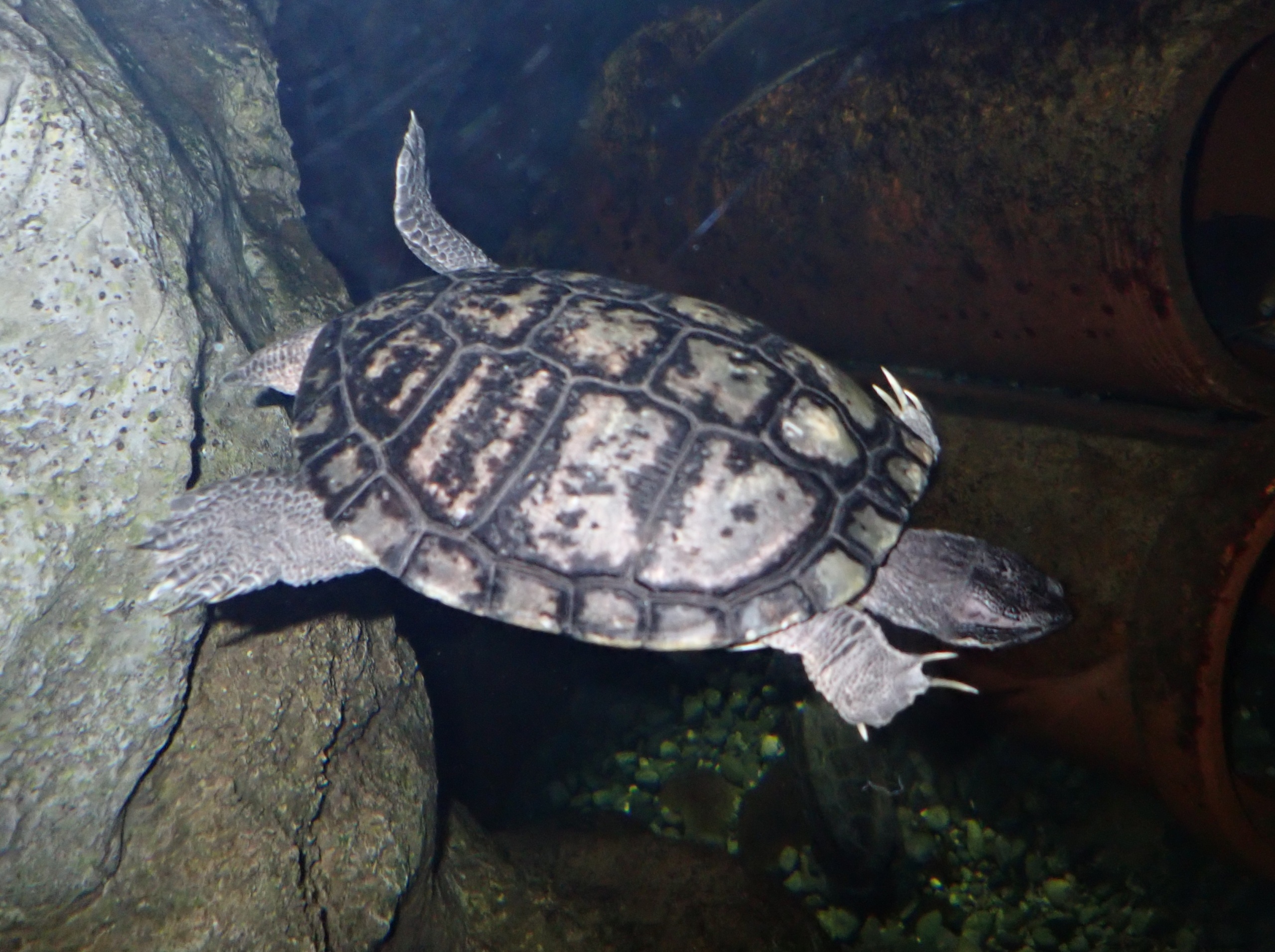 当館の「流れのアクアリウム」の左から2番目、下流域には、8匹のカメがくらしています。
