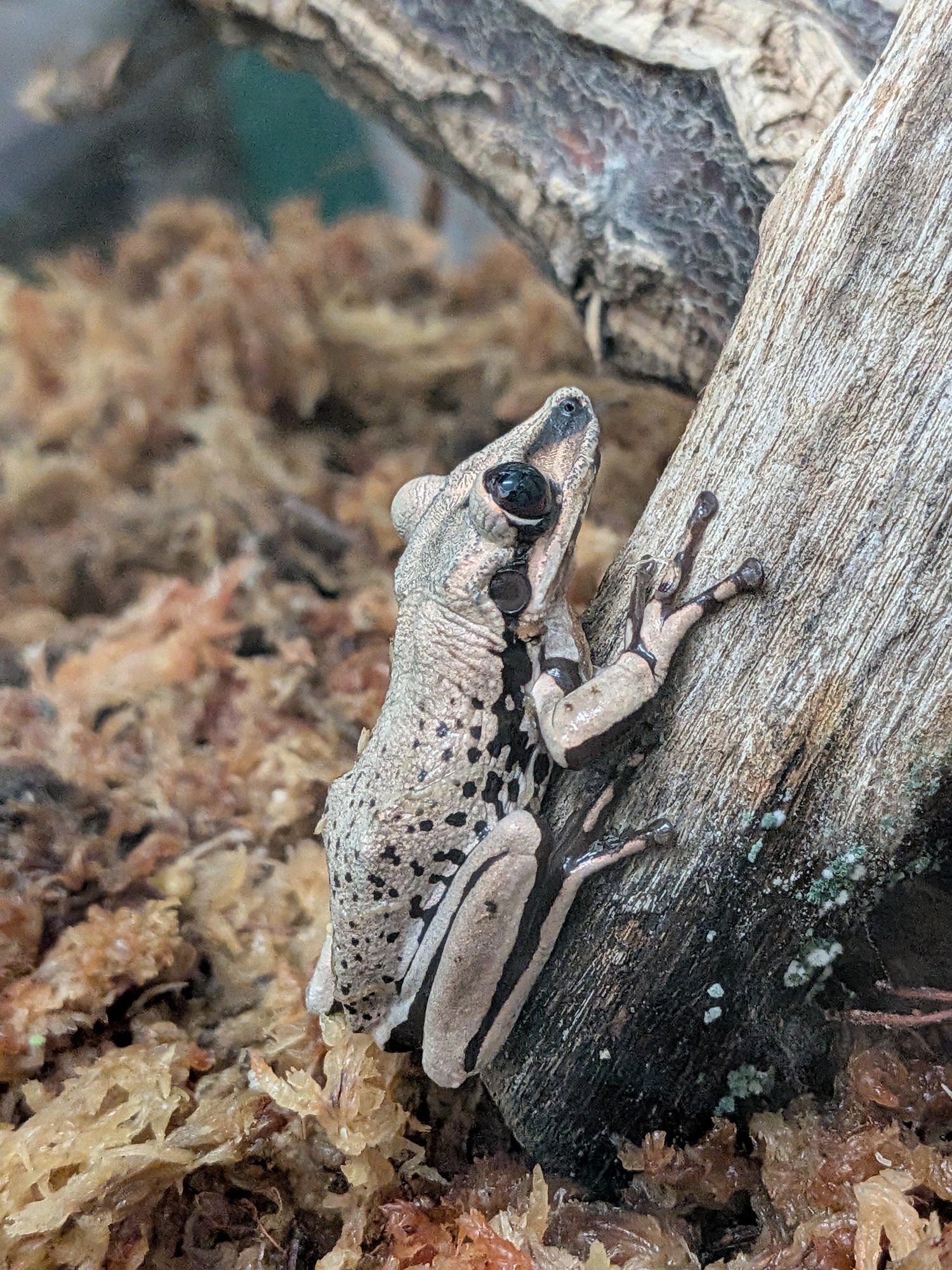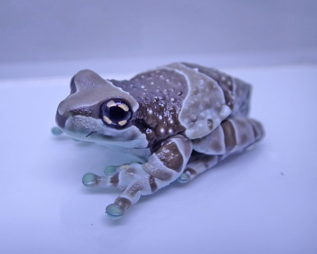 身の危険を感じると皮膚から乳状の白い毒液を出すことから、別名ミルキーフロッグと呼ばれています。水槽の手前側にはり付いている時に見ることができる水色のきれいな指先がおすすめポイントです。