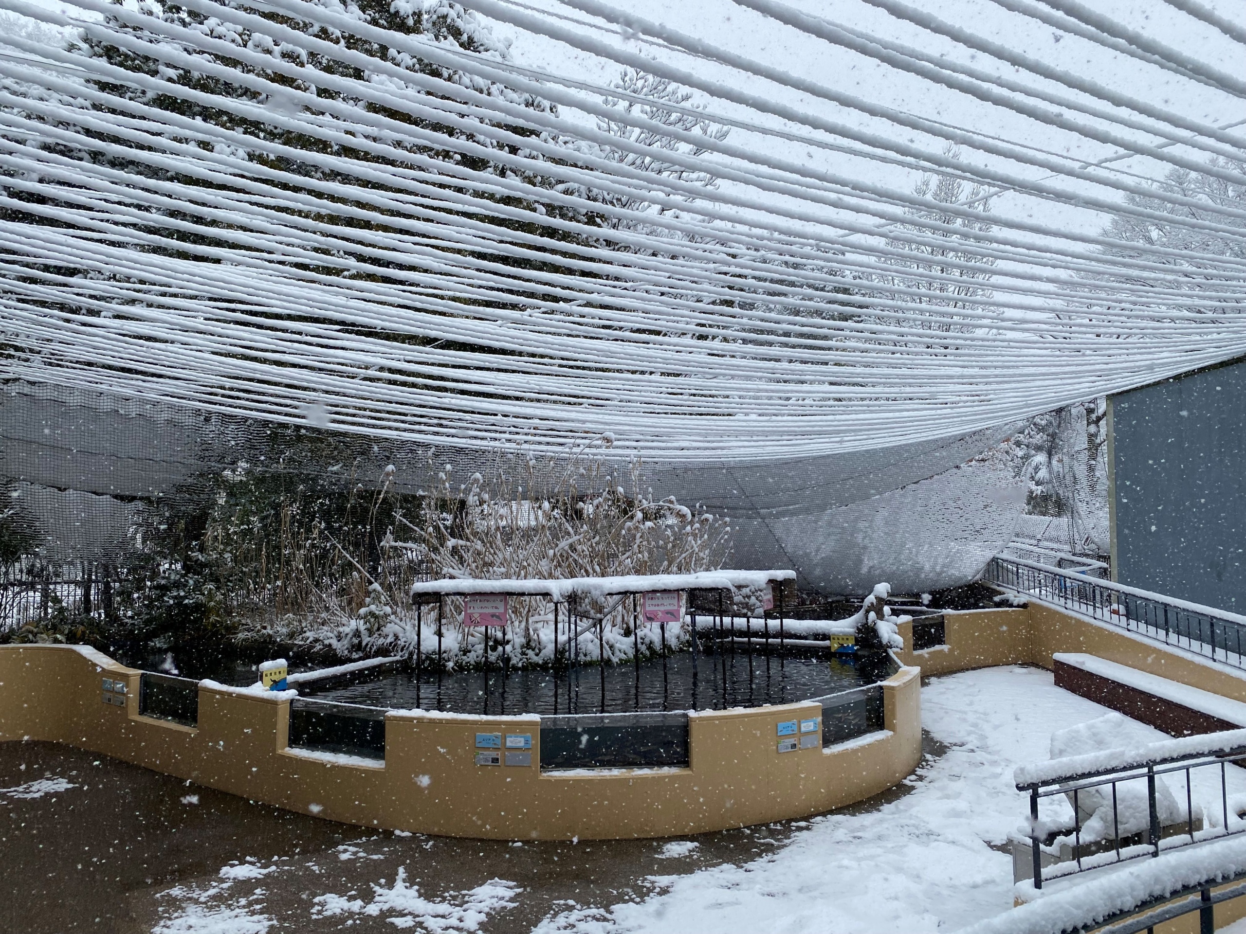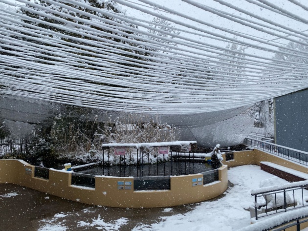 小川のアクアリウムは周囲だけでなく、鳥よけの紐にも雪が積もりました。