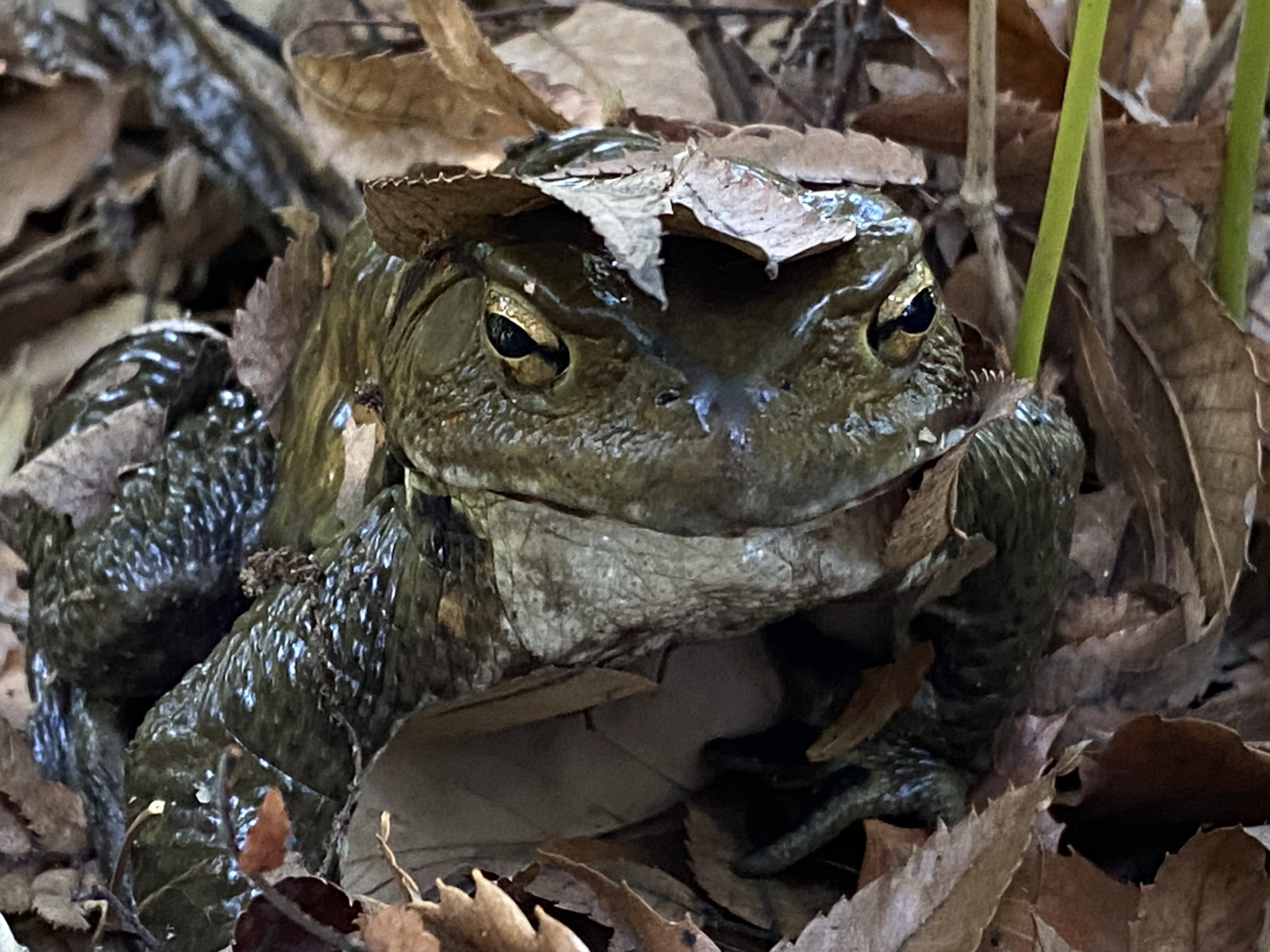 頭に落ち葉をのせて、周囲に紛れ込むアズマヒキガエル!
